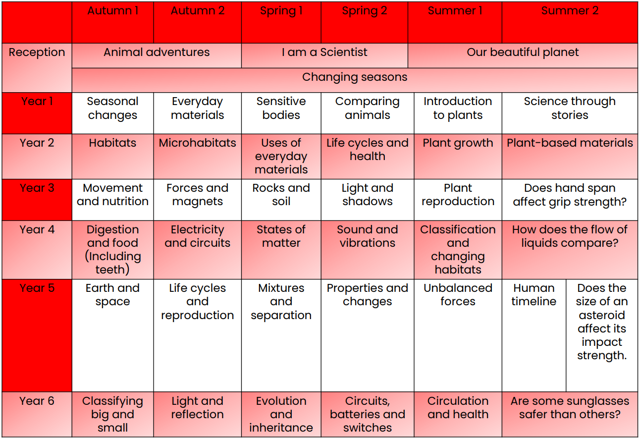 Our curriculum is a carefully planned model of progression, where scientific knowledge and working scientifically build in complexity from EYFS through to the end of KS2. Children are encouraged to ask questions, explore, and investigate the world around them through hands-on enquiry. By broadening and deepening their understanding of key scientific concepts, our curriculum empowers pupils to make sense of natural phenomena, appreciate the impact of science on our lives, and recognise their role as future problem solvers in an ever-changing world.